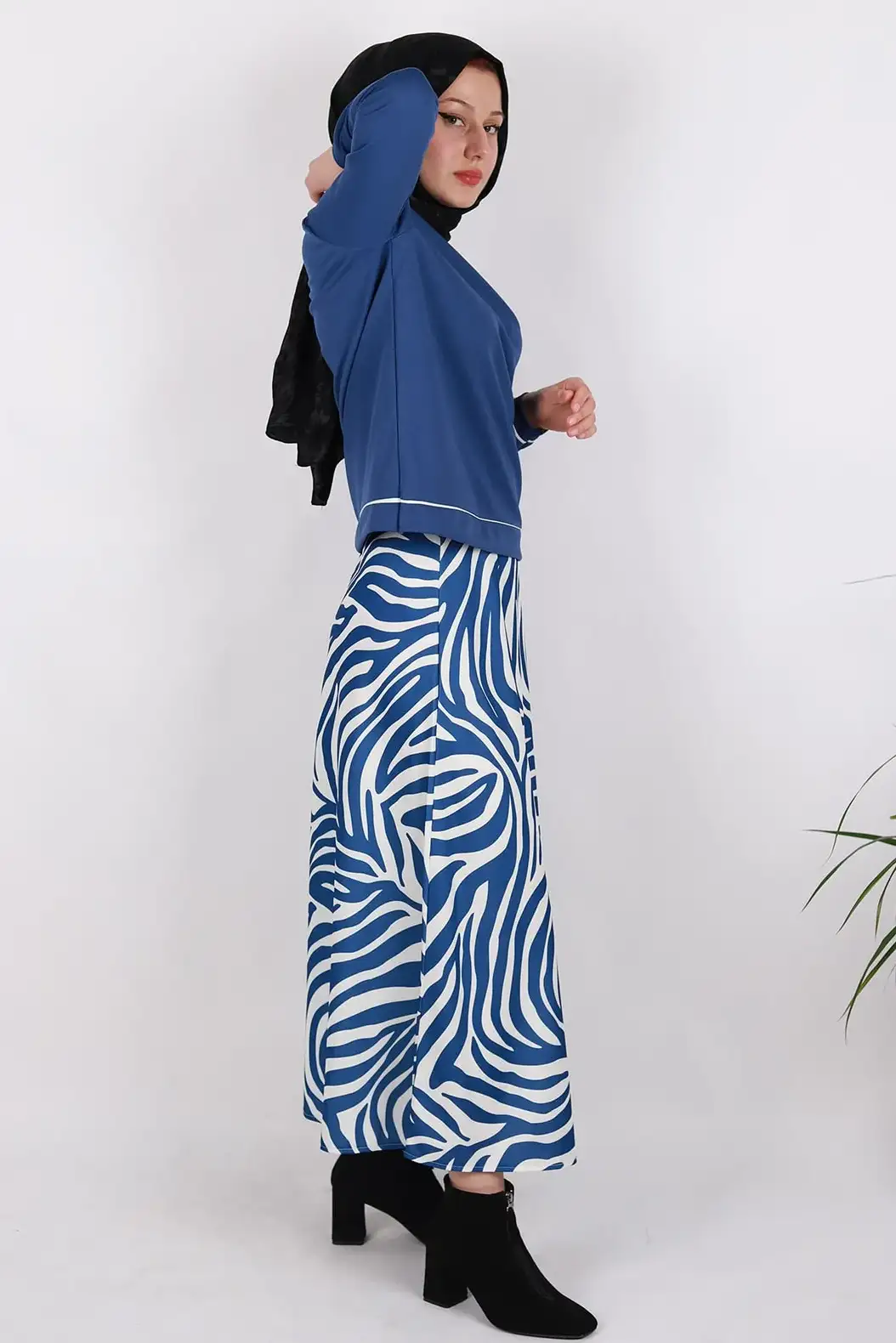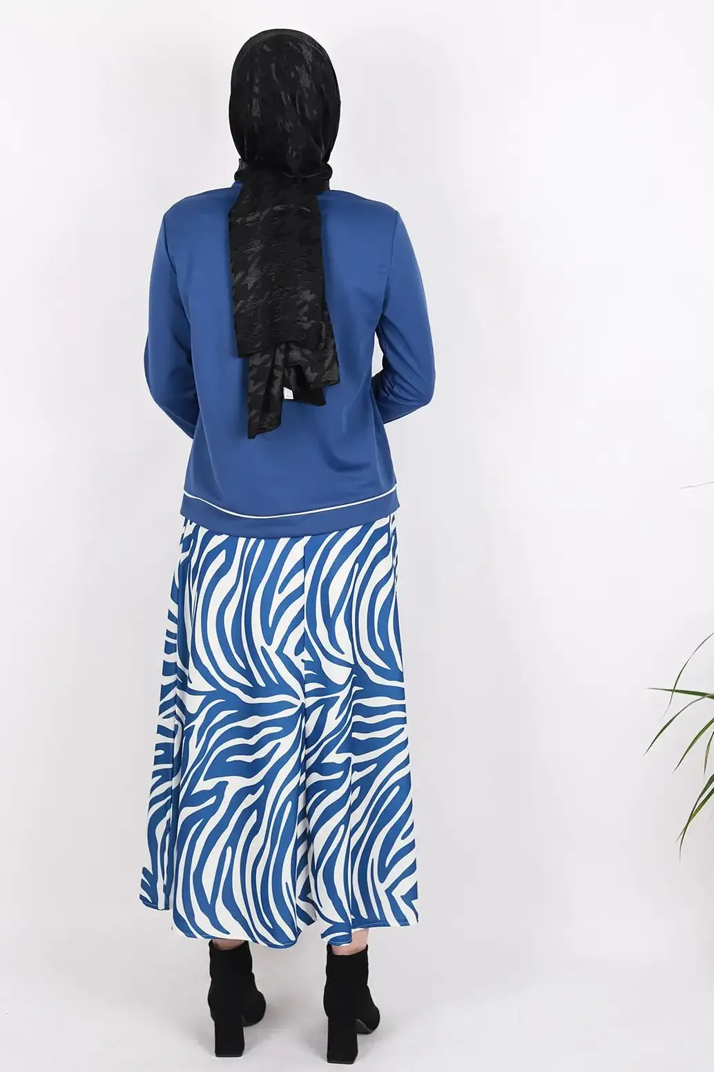 Desenli Scuba İkili Takım İndigo, zarif indigo tonlarıyla enerjik bir görünüm sunarken, zebra desenli eteğiyle dikkat çeken modern bir kombin imkanı sağlar. Düz üst parçası, bilek ve etek ucundaki beyaz şerit detayıyla sportif bir şıklık katar. Scuba kumaşı sayesinde esnek, tok ve kırışmayan bir yapıya sahiptir.