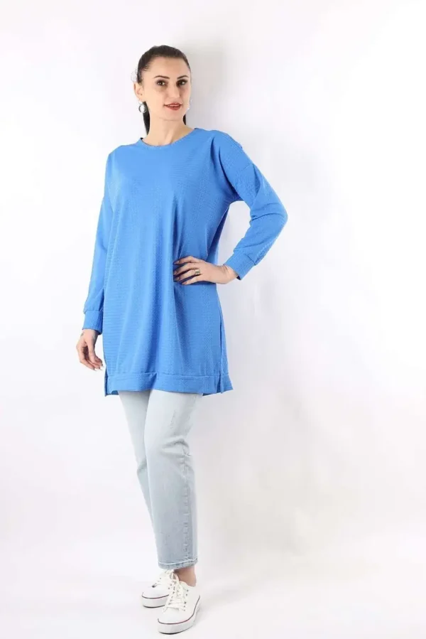 Yumuşak dokulu kumaşı ve dökümlü yapısıyla günlük kombinlerin vazgeçilmezi olacak bu tunik, farklı pantolon ve ayakkabılarla kolayca kombinlenebilir.