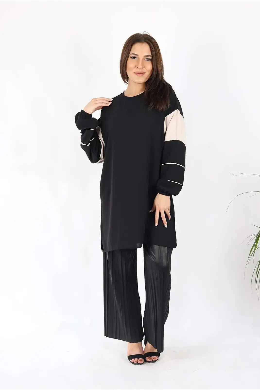 Zarif, sade ve modern bir görünüm sunan Garni Detaylı Aurobin Kumaş Tunik – Siyah, konforlu kalıbı ve koldaki kontrast renkli garni detaylarıyla stilinize sportif bir şıklık kazandırır. Siyah rengin zamansız şıklığı, kol üzerindeki bej tonlarındaki bloklarla hareketlenerek fark yaratan bir görünüm sunar. Bileklerde yer alan lastik detaylar kullanım kolaylığı sağlarken, aynı zamanda modern bir dokunuş katar.