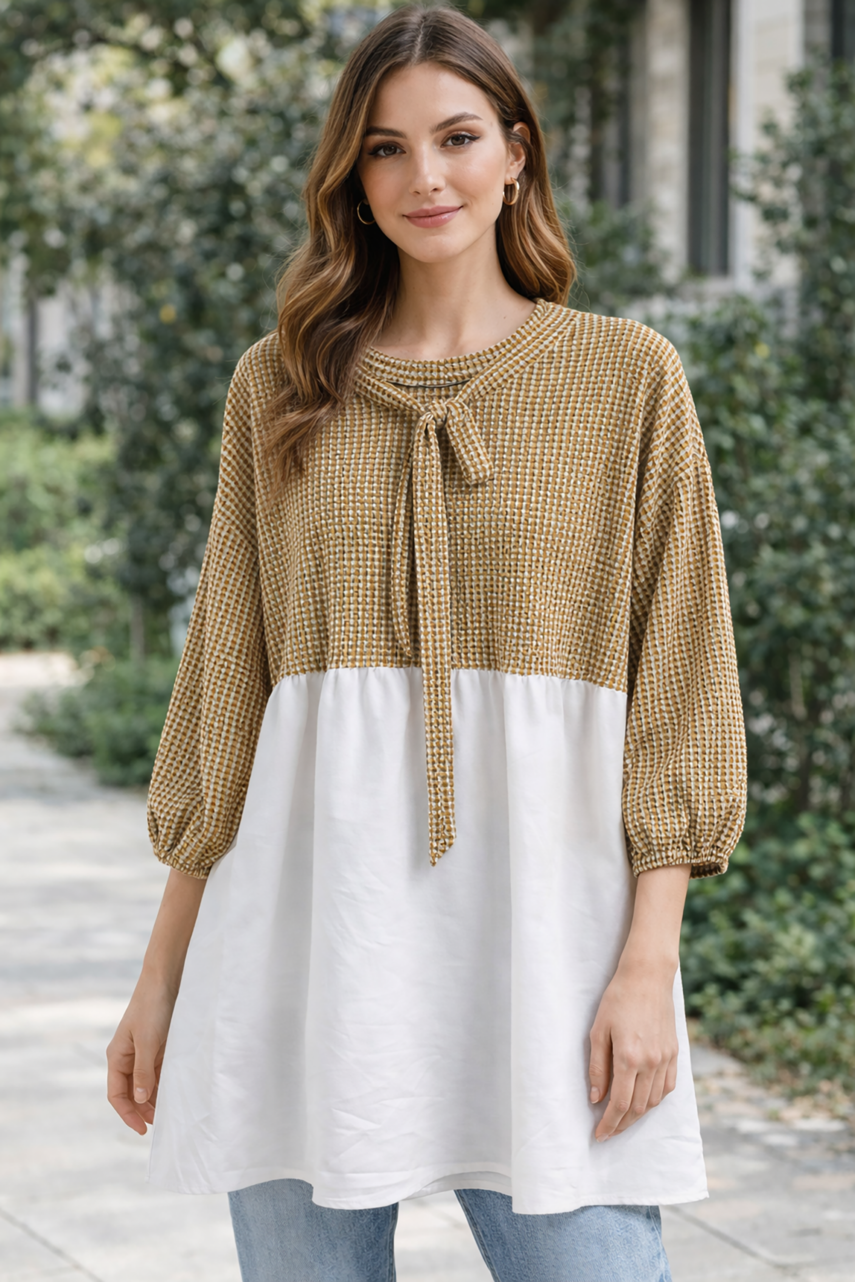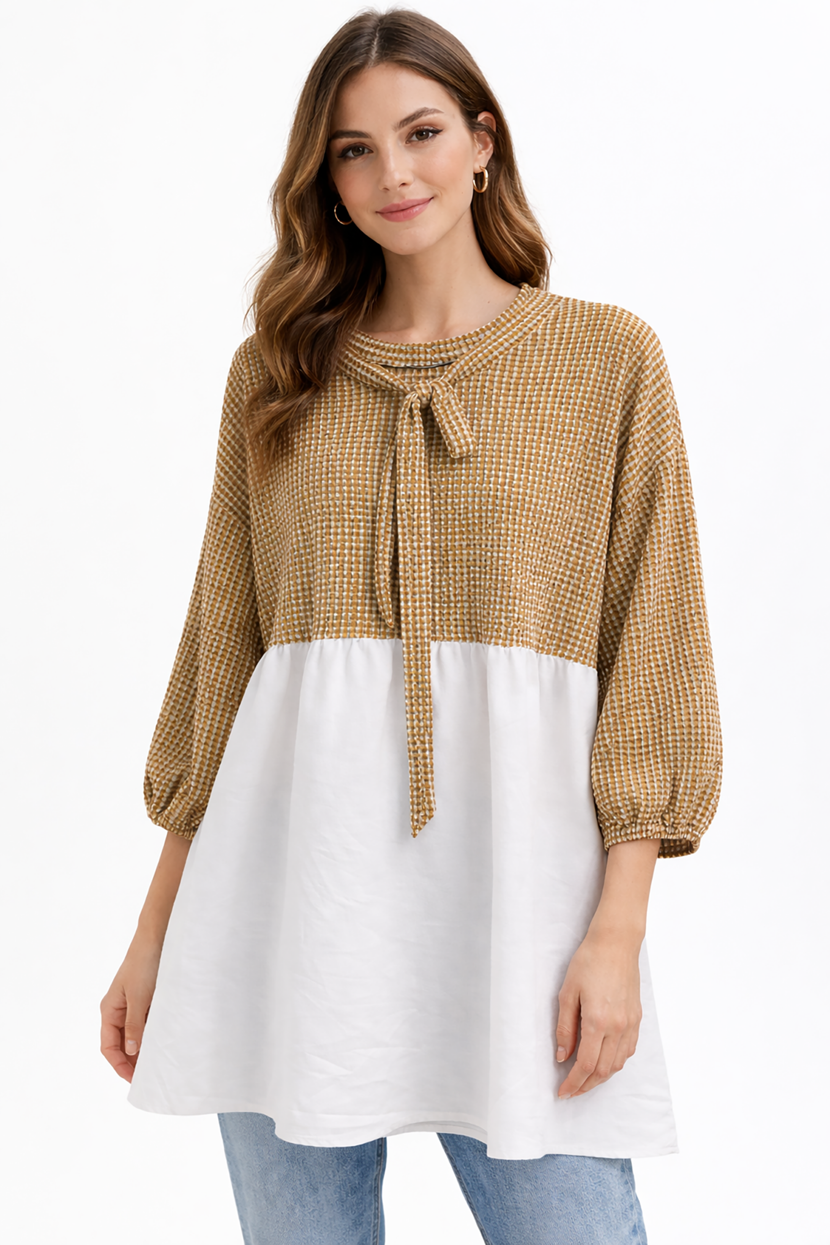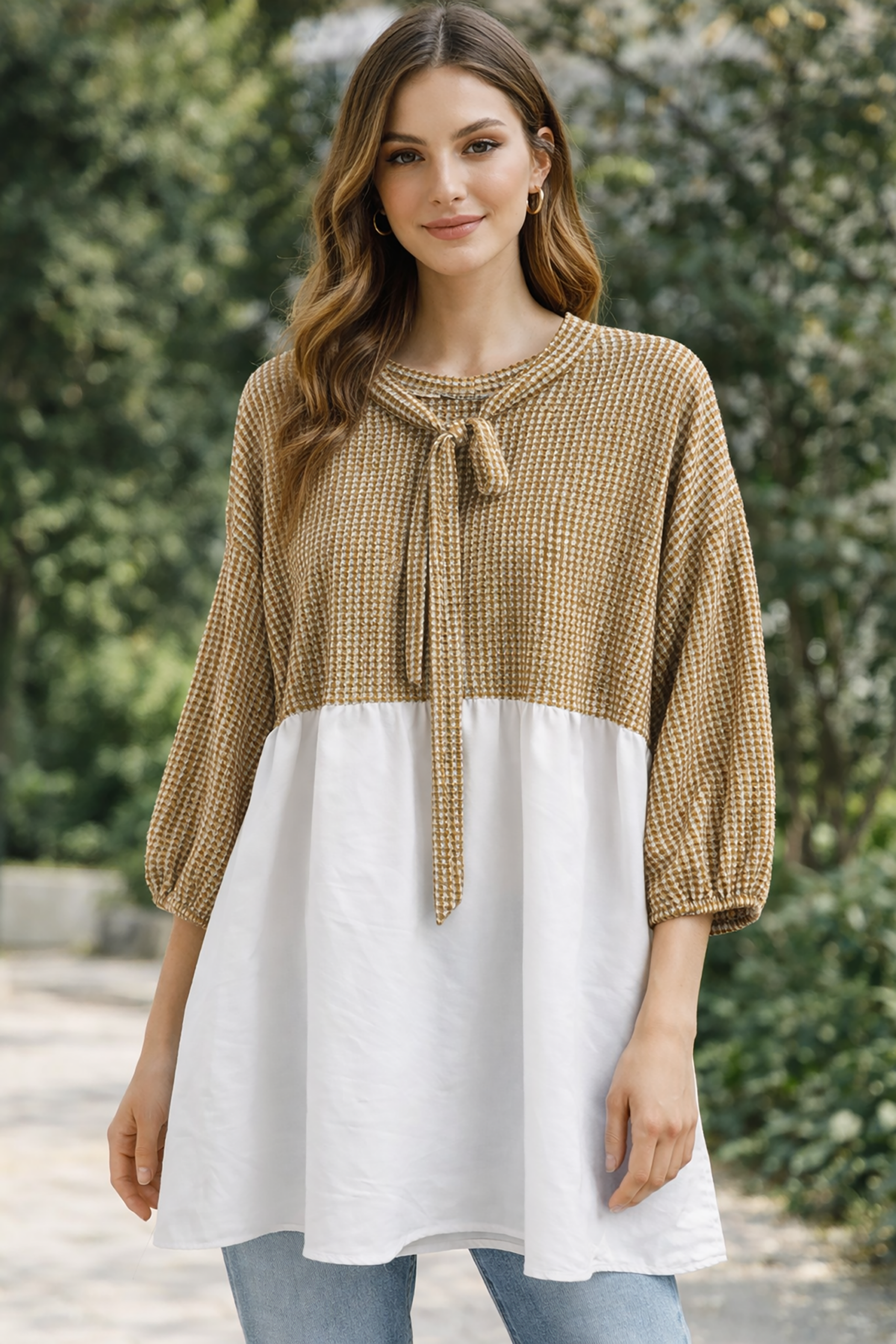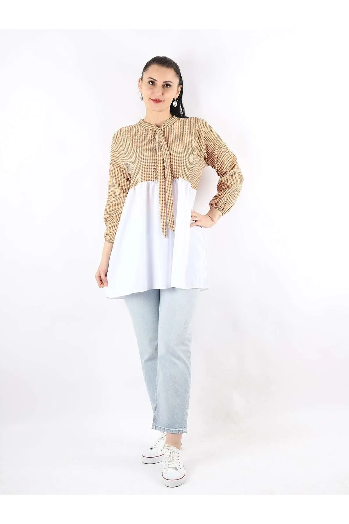 Gofre Desen Bağcıklı Tunik Camel, Rahat kesimiyle tüm yaş gruplarına uygun, her vücut tipine uyum sağlayan regular kalıp.; Zamansız baskılı deseniyle, farklı stilleri tamamlayacak şık bir görünüm sunan gofre dokuma kumaş yapısı.; Nötr camel rengiyle kolayca kombinlenebilen ve her ortamda şıklığınızı koruyan tunik modeli.; Günlükten özel davetlere kadar geniş kullanım alanına sahip, her duruma uyum sağlayabilen regular boy tasarımı.; Dayanıklı dokuma tipi sayesinde uzun süreli kullanım için ideal; kaliteli malzeme kullanımı ile konforlu bir deneyim sunar.