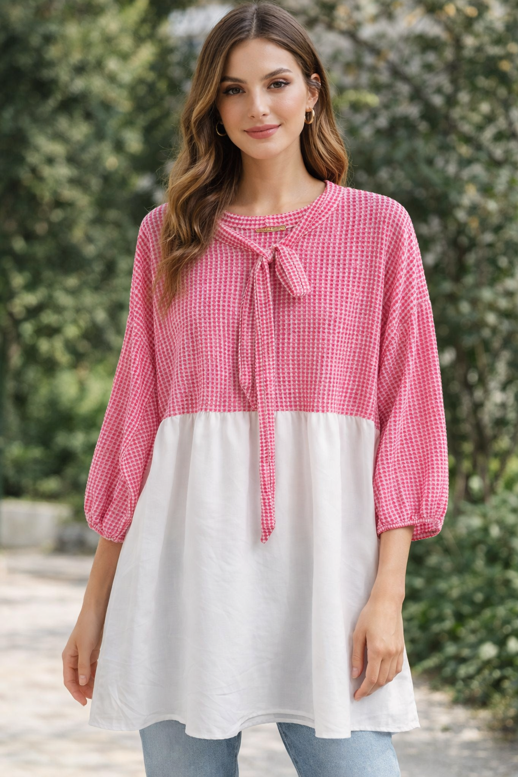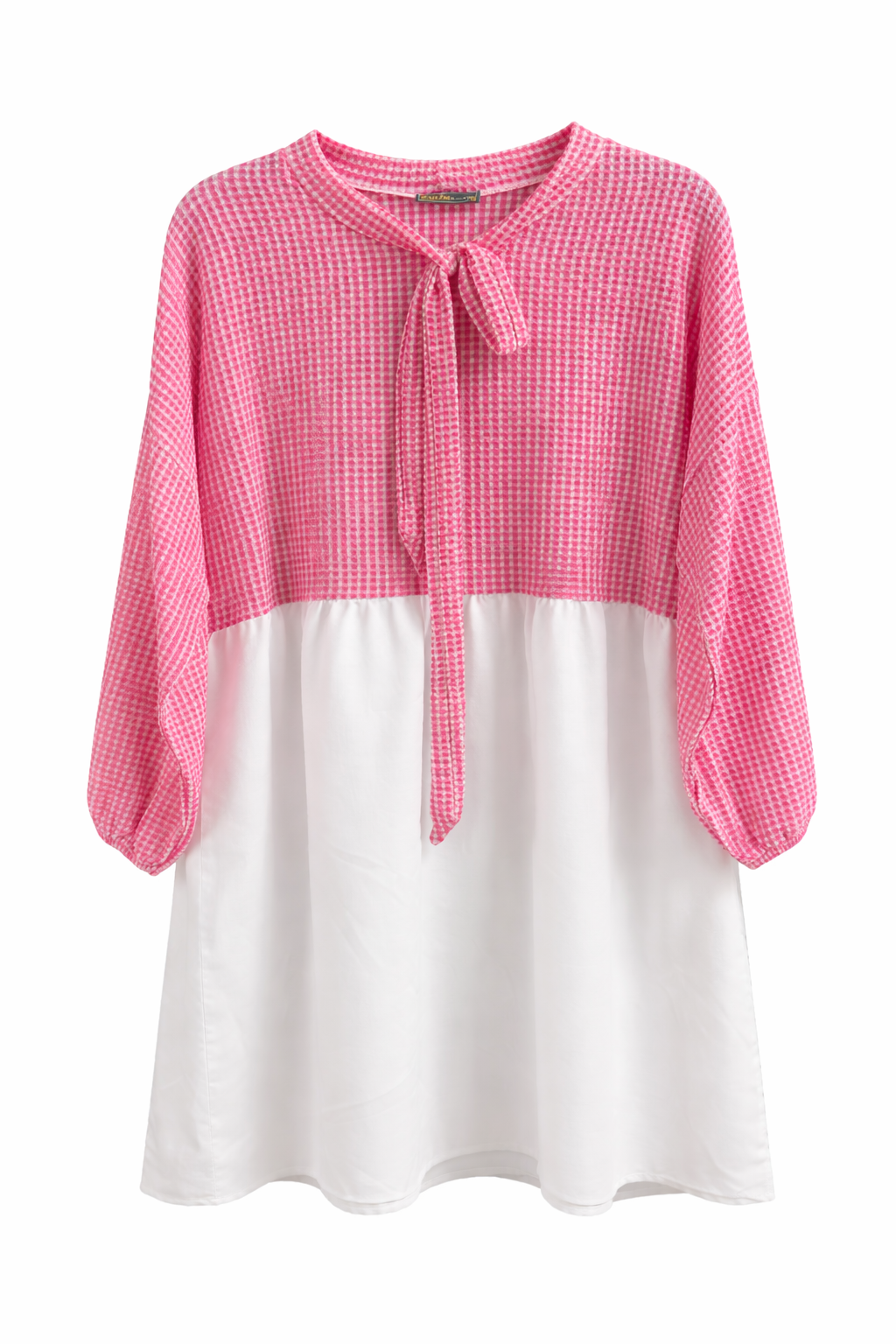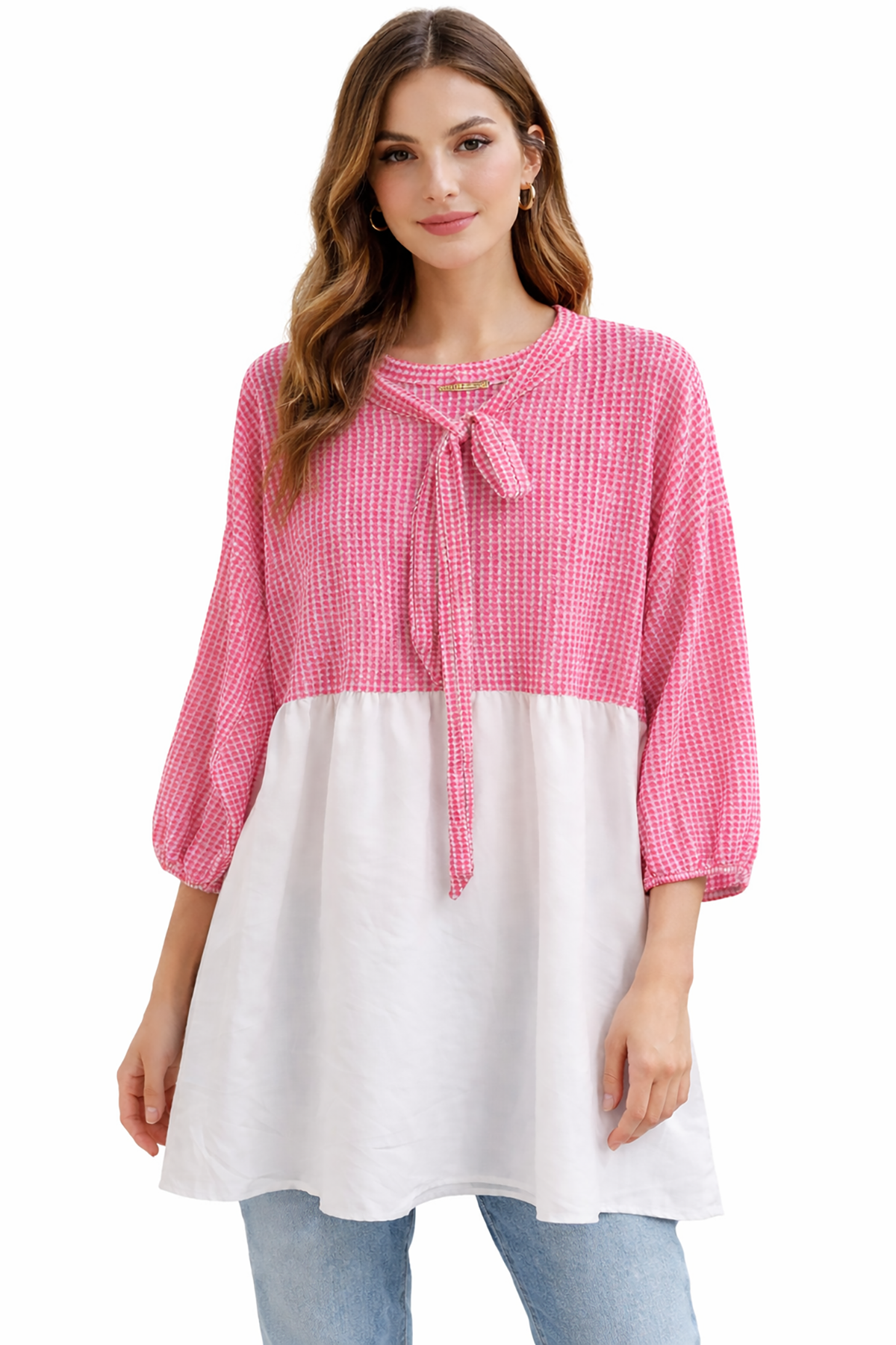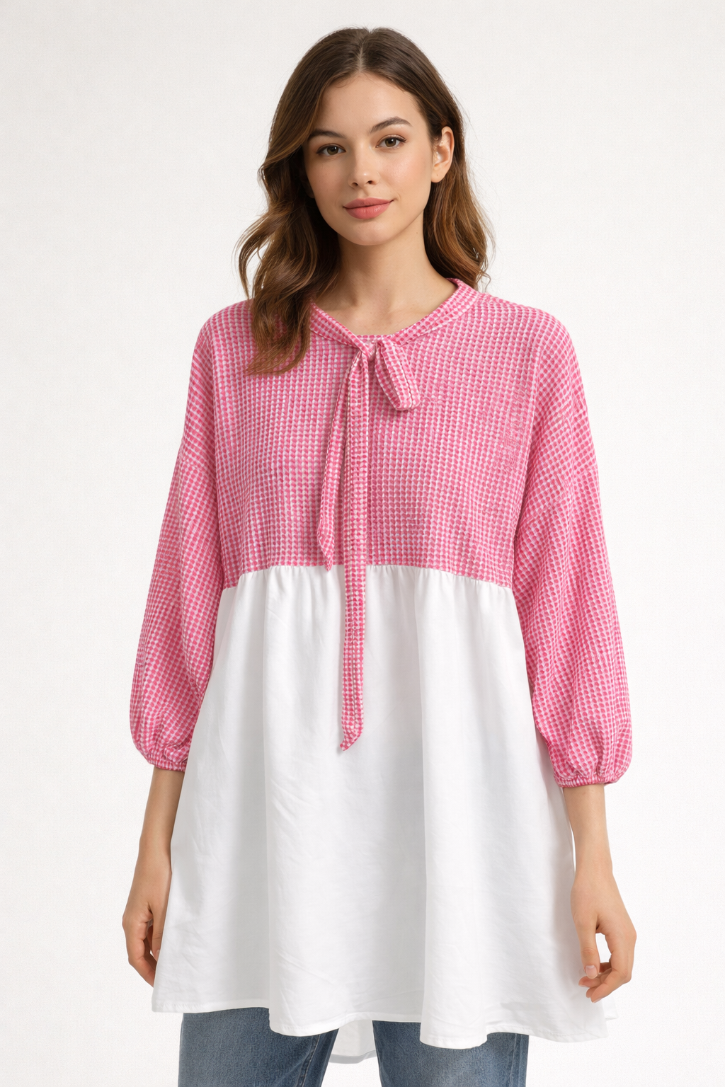 Göz alıcı fuşya rengiyle dikkat çeken bu tunik, her ortamda stilinizi öne çıkarır.; Gofre dokuması sayesinde hafif ve nefes alabilen yapısıyla gün boyu konfor sağlar.; Baskılı deseniyle modern ve şık bir görünüm sunan bu tunik, her türden aksesuarla kolayca kombinlenebilir.; Regular kalıbı sayesinde rahat bir kullanım deneyimi yaşatırken, farklı vücut tiplerine uyum sağlar.; Her yaş grubuna hitap eden tasarım anlayışıyla geniş bir kullanıcı kitlesinin tercihi olur.; Dokuma kumaş tipi, dayanıklılığı artırarak uzun süreli kullanım imkanı tanır.