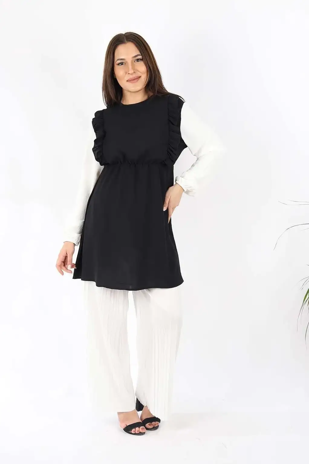 Zarif, modern ve şık bir görünüm sunan Kolları Lastik Detaylı Aurobin Kumaş Tunik – Siyah, konforlu kesimi ve volan detaylarıyla stilinize feminen bir dokunuş katıyor. Göğüs hattından itibaren gelen lastikli bel detayı vücut formunu nazikçe vurgularken, kollarındaki lastik bileklikler ise hem estetik hem de işlevsel bir kullanım sağlıyor.