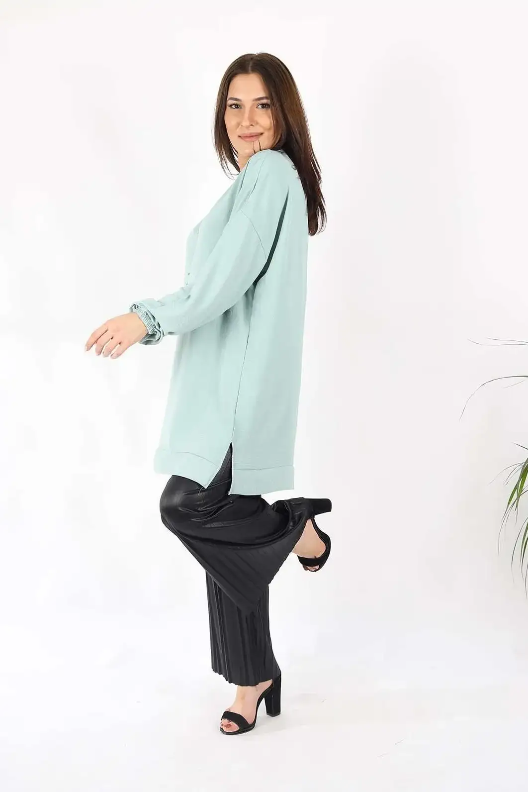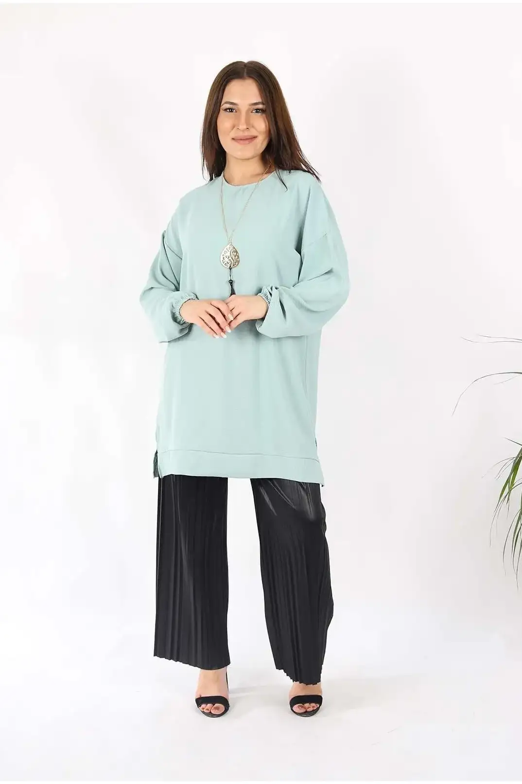 Kolyeli Aurobin Kumaş Su Yeşili Tunik, zarif ve ferah görünümüyle ilk bakışta etkileyici bir stil sunar. Hafif ve dökümlü aurobin kumaşıyla gün boyu konfor sağlarken, üzerinde yer alan kolye detayıyla ekstra bir şıklık kazandırır. Su yeşilinin huzur veren tonu, doğal bir sadelikle buluşarak hem gündelik kullanımda hem de özel günlerde şık bir alternatif haline gelir.