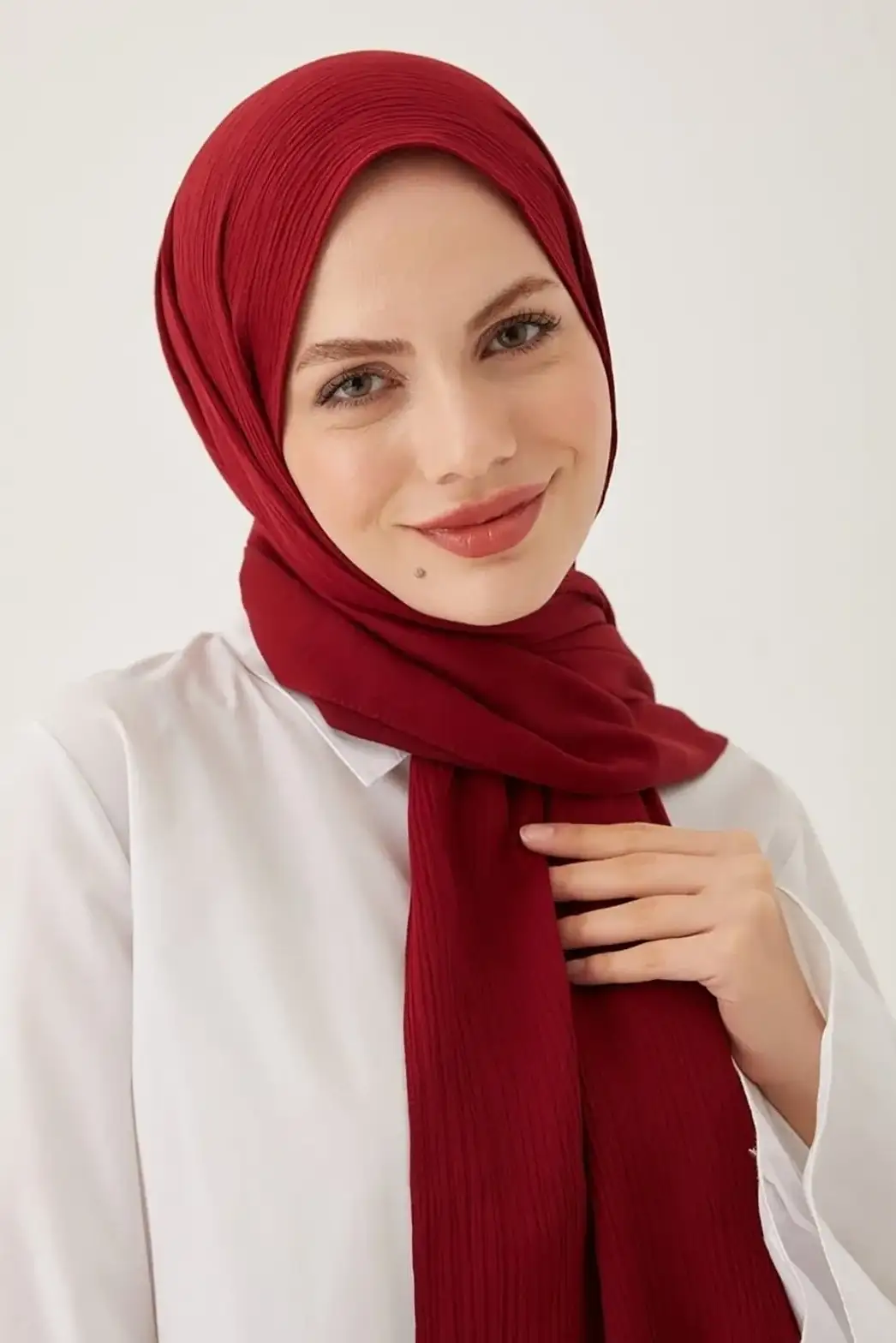 Krinkıl İpeği Şal Bordo, göz alıcı rengi ve doğal kırışık dokusuyla iddialı ama sade bir şıklık sunar. Tok yapısı sayesinde başta kolay şekil alır ve kaymaz. Ütü gerektirmeyen bu model, günlük koşuşturmada pratikliği ve konforu bir araya getirir.