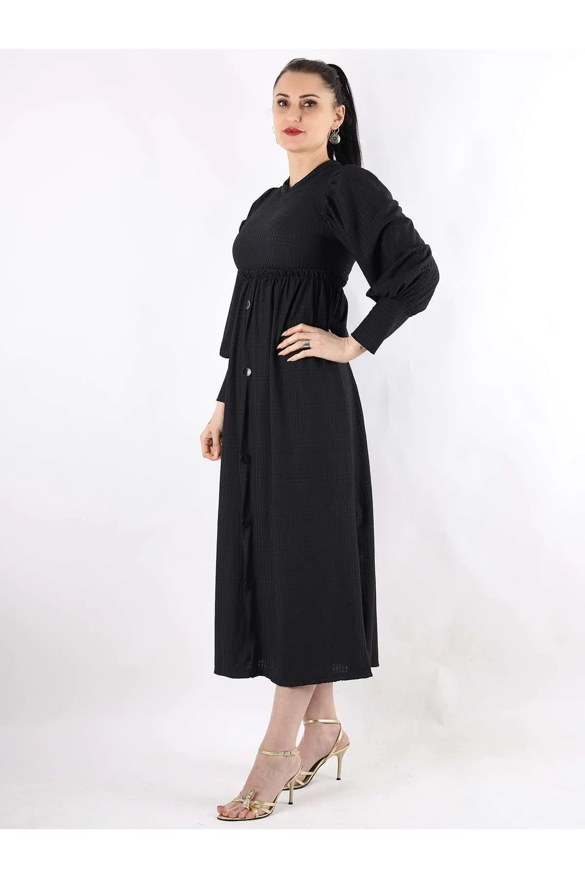 Zarif dokuma kumaşı ile üretilmiş, ince yapısıyla gün boyu rahatlık sunar.; Önünde yer alan düğme detayları, klasik ve zamansız bir stil oluştururken aynı zamanda şıklığına şıklık katar.; Desenli tasarımıyla göz alıcı bir görünüm sağlayarak, farklı kombinlerle kolayca uyum sağlar.; Siyah rengiyle her zaman moda olan bu elbise, gardrobunuzdaki diğer parçalarla kolayca eşleştirilebilir.