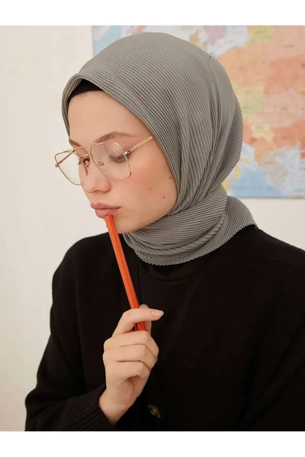 Düz Plise Eşarp Gümüş Gri, minimal tarzı zarafetle buluştururken sade duruşuyla stilinizi öne çıkarır.
