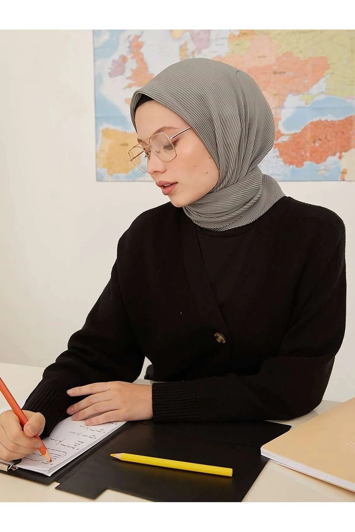 Düz Plise Eşarp Gümüş Gri, minimal tarzı zarafetle buluştururken sade duruşuyla stilinizi öne çıkarır.