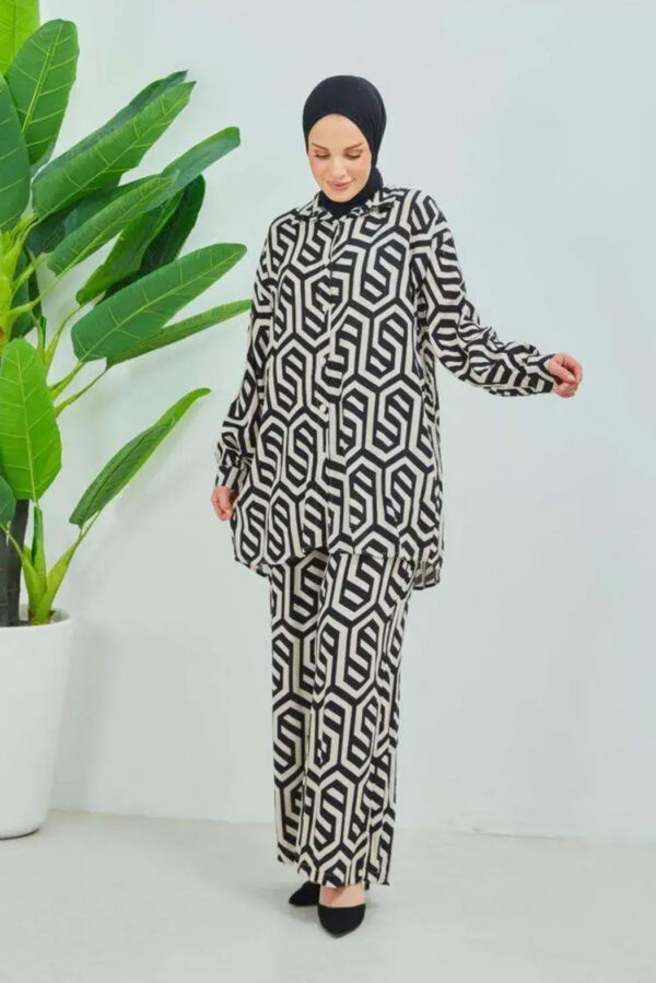 Triko kumaş, iki parçalı takım, şerit detaylı tasarım, bisiklet yaka/bağlama detaylı yaka formu, uzun kollu tunik üst, oversize rahat kalıp, geniş paça pantolon, yumuşak dokulu, esnek yapı, günlük kullanıma uygun, spor-şık stil.
