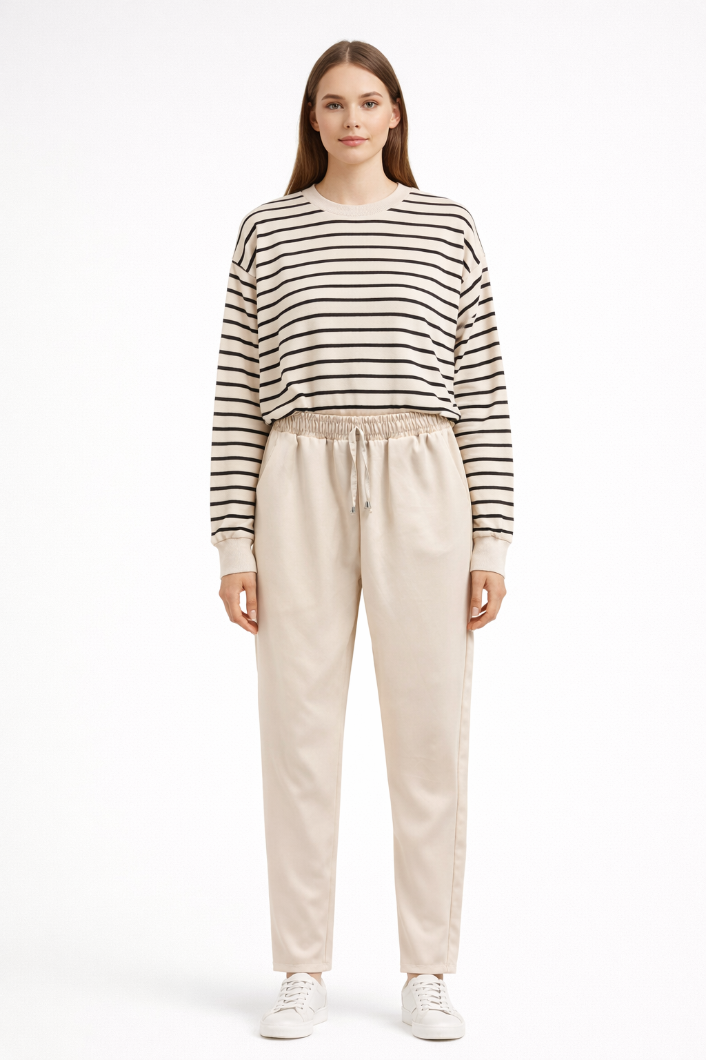 Bej rengin minimal ve modern duruşu, bu pantolonu kombin açısından güçlü bir parça haline getirir. Günlük şehir stilinde sneaker ve basic tişörtle tamamlayabilir, daha şık bir görünüm için crop bluz veya gömleklerle kombinleyebilirsiniz. Ev giyiminde ise oversize üstlerle rahat bir stil oluşturur. Hafif yapısı sayesinde hem serin havalarda hem mevsim geçişlerinde tercih edilebilir. Dolabınızda hem casual hem spor kombinler için güvenle kullanabileceğiniz zamansız bir kadın pantolonudur.