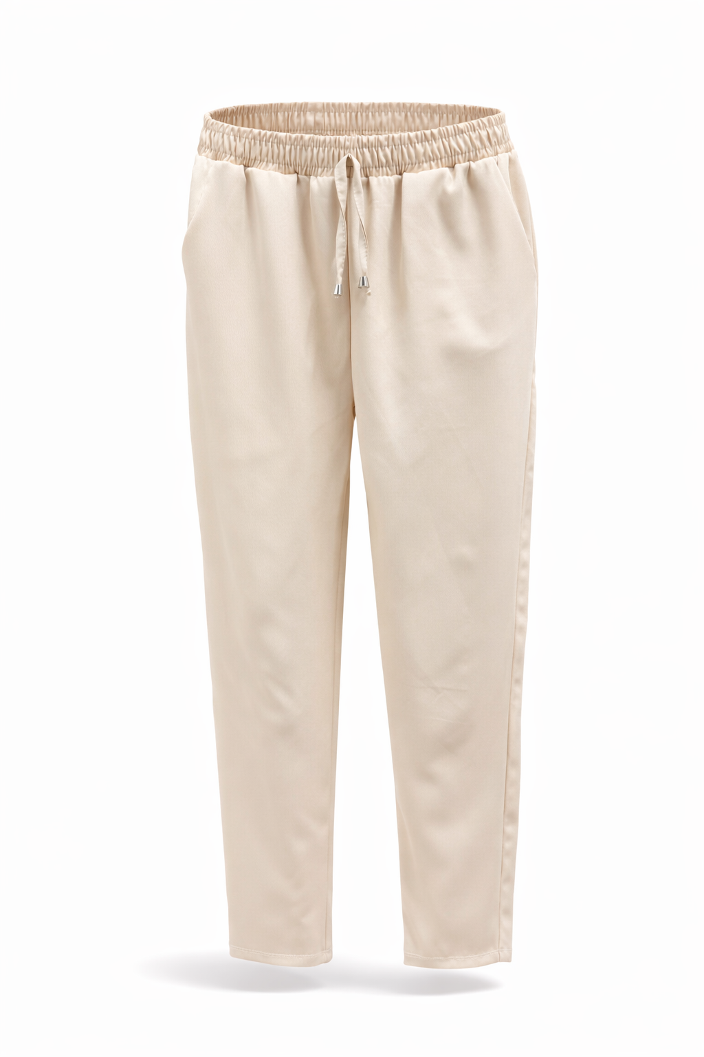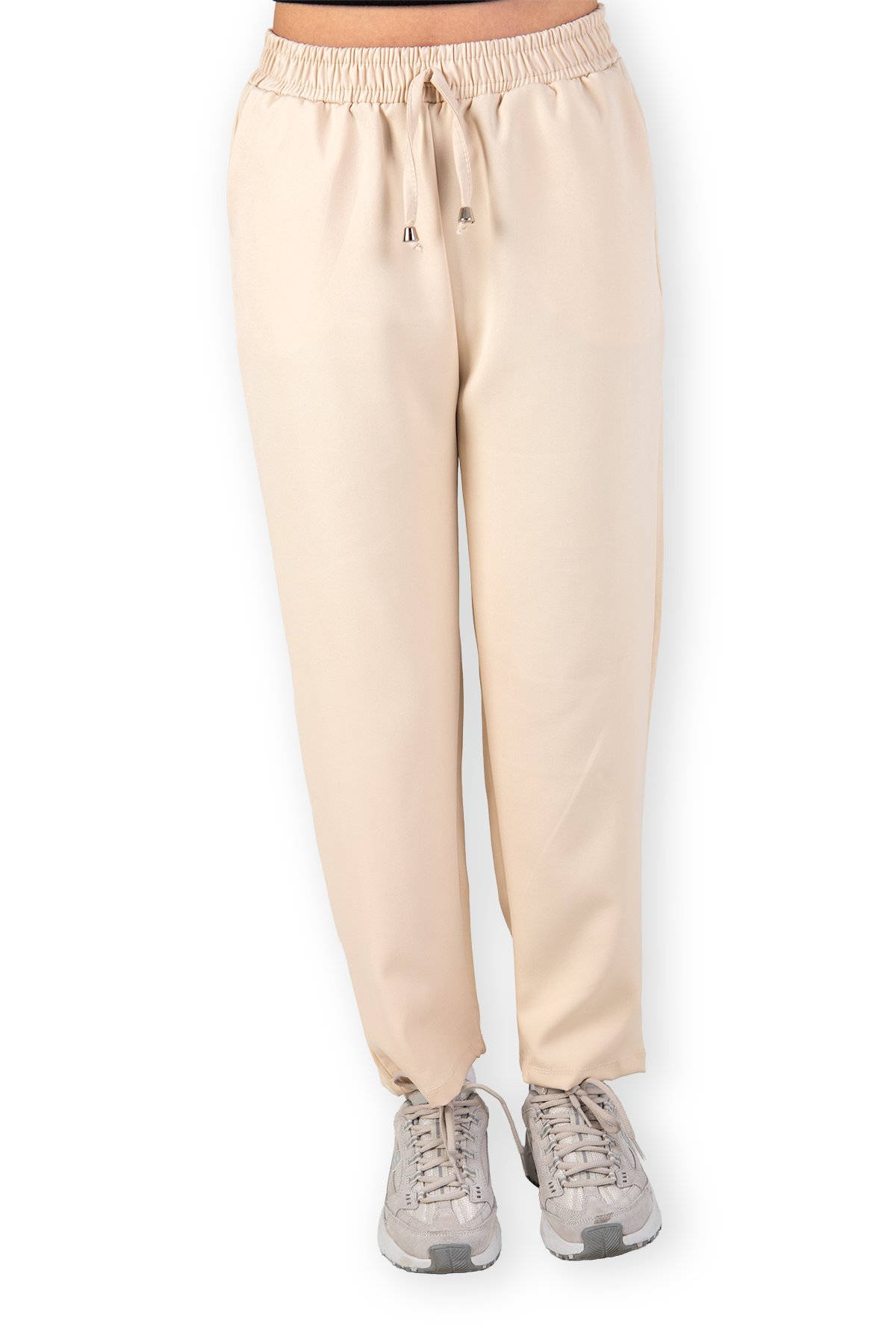 Yüksek bel tasarım, Ayarlanabilir bağcıklı bel detayı, Rahat ve düz paça kesim, Günlük kullanıma uygun konforlu yapı, Yumuşak dokulu kumaş, Zamansız bej renk, Casual ve spor kombinlere uyumlu, Mevsim geçişlerinde kullanıma uygun.