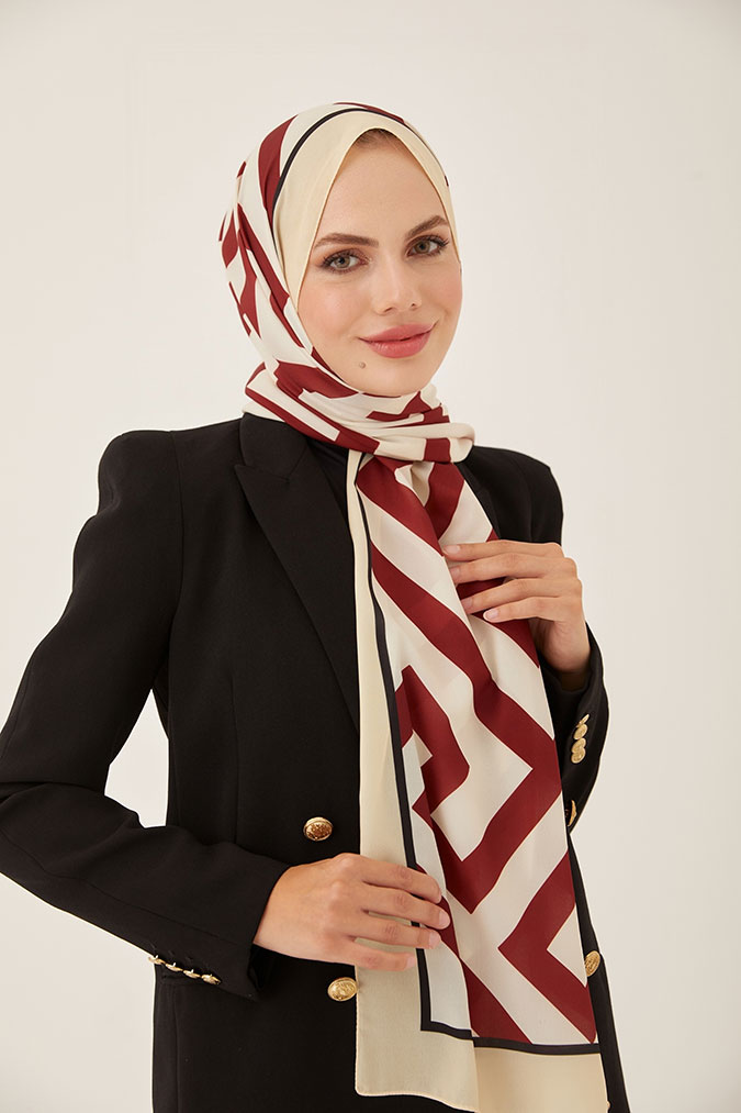 Zikzak Desen Krep Şal – Bordo, siyah, krem, bej veya bordo tonlarındaki dış giyimlerle mükemmel bir uyum sağlar. İş kombinlerinde blazer ceketler ve klasik pantolonlarla; günlük kombinlerde ise sade tunikler ve spor ayakkabılarla kombinleyebilirsiniz. Altın ya da bordo aksesuarlarla görünümünüzü tamamlayabilirsiniz.